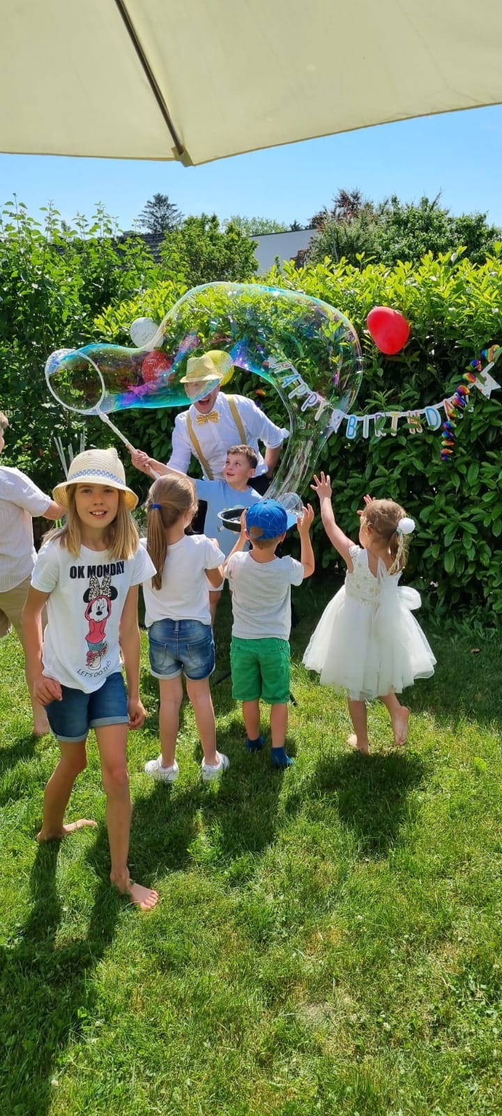 Every bubble show outdoor is different: sometimes the bubbles shimmer in the sun, sometimes they dance in the breeze. But one thing always stays the same – the wonder in the eyes of the children. It’s an experience full of joy and lightness – like capturing a piece of summer inside a bubble.