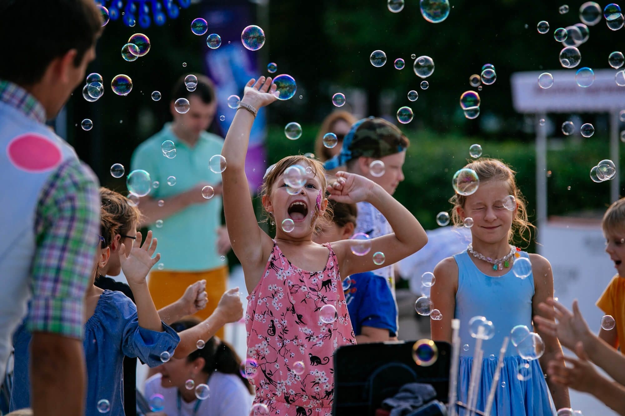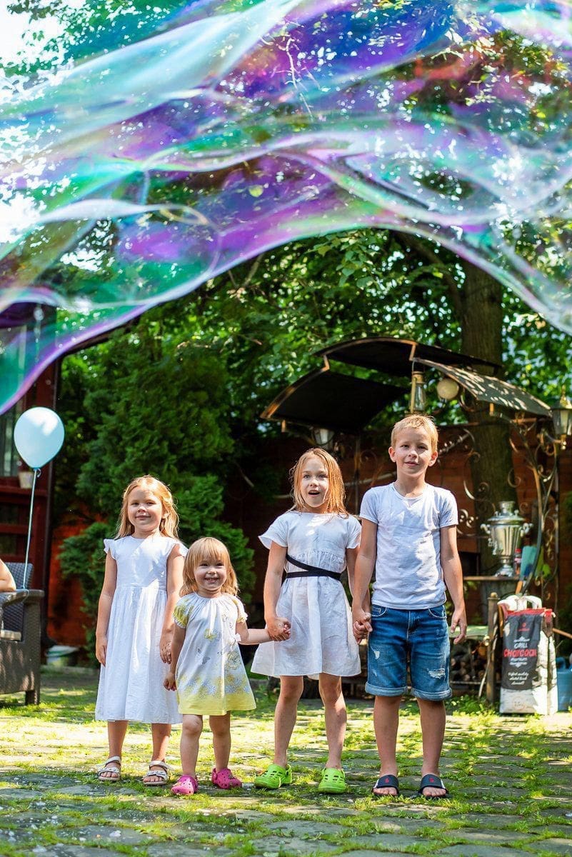 Imagine a warm summer afternoon. A soft breeze moves through the air, the sun glows gently – and suddenly the sky above your celebration fills with shimmering, dancing soap bubbles. They float and reflect the light, bringing smiles to both children and adults. Outdoor bubbles are pure joy – and in the hands of professionals, they become a real bubble show outdoor, full of elegance, rhythm, and magic. Whether it’s a family celebration, a park festival, or a garden wedding – we bring sparkle and delight straight into the open air.